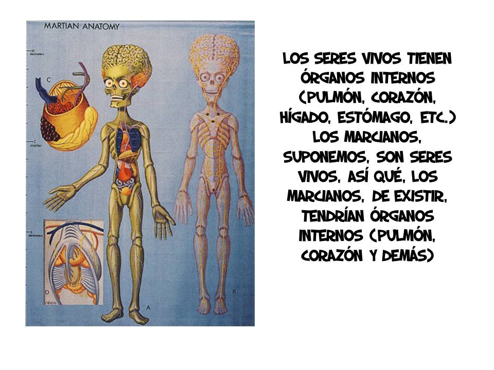 Los científicos que piensan más seriamente la posibilidad de vida en otros planetas suponen muchas cosas con base a lo que sabemos sobre la vida en la Tierra. Por ejemplo, suponen que para que haya vida es necesario que el planeta esté a cierta distancia de su sol para que la temperatura permita la existencia de agua en estado líquido, etc. (Para más información hacer clic aquí).Sin embargo, en lo mencionado en la imagen anterior se comete el error de suponer que todos los seres vivos tienen pulmones, corazón y otros órganos. Simplemente pensemos en las plantas: Estos seres vivos no tienen los órganos propios de los animales. Que tal si la vida extraterrestre es más semejante a las plantas que los animales. Por lo tanto, la anatomía de los marcianos sería completamente diferente a lo que se presenta líneas arriba.